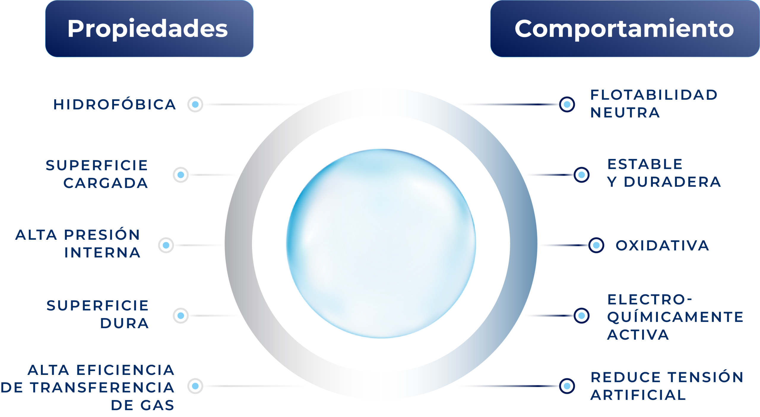 - Esta ampliación exponencial en el área superficial, junto con la carga negativa característica de las nanoburbujas, confiere estos beneficios: