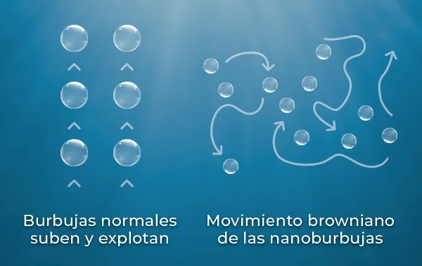Las nanoburbujas son burbujas de gas extremadamente pequeñas —del orden de los nanómetros (10⁻⁹ m), similares al tamaño de un virus— que permanecen suspendidas en el agua durante largos periodos. A diferencia de las burbujas grandes, no “suben y revientan” rápidamente: se dispersan de forma homogénea, manteniendo un suministro de gas disponible en todo el volumen del líquido. Una forma simple de imaginarlo: como si el agua quedara “cargada” de miles de millones de micro‑reservorios de gas, listos para actuar donde y cuando se necesitan.