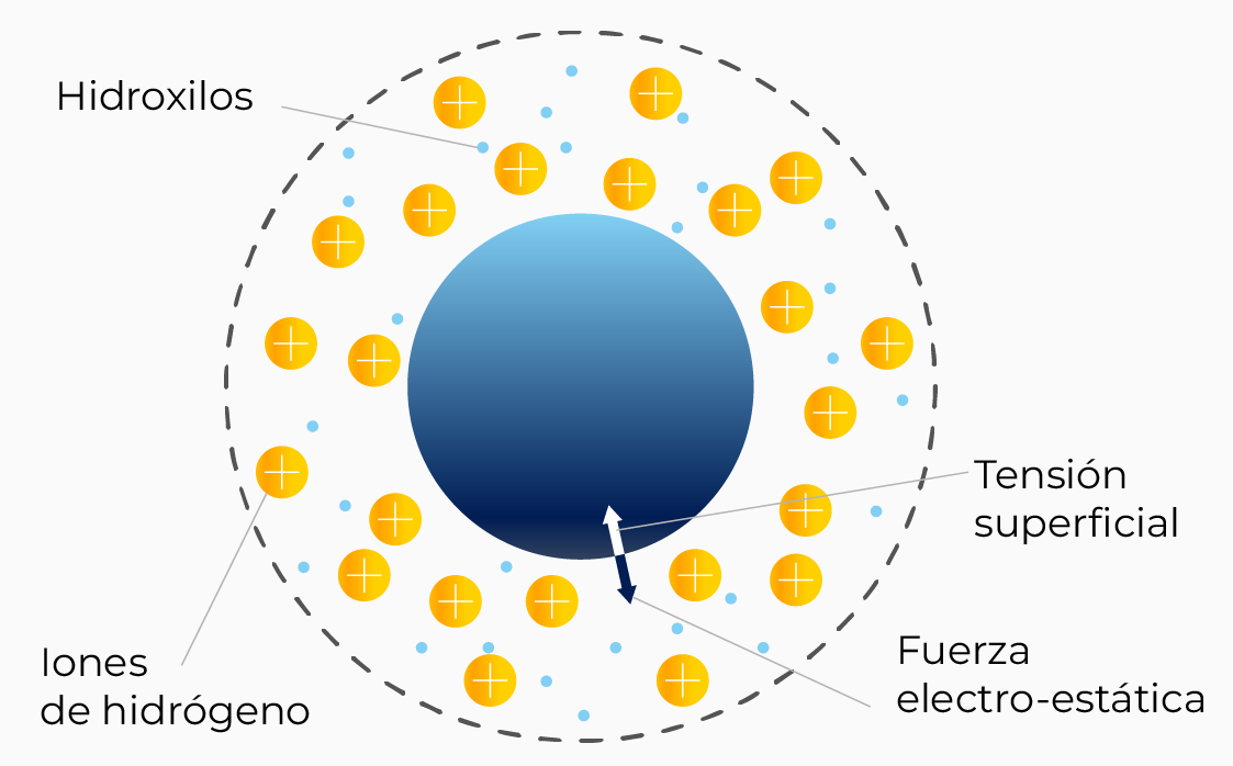 Presentan una carga superficial (zeta) que favorece su estabilidad y les confiere interacción electroquímica. Por su flotabilidad prácticamente neutra, permanecen suspendidas y distribuidas de manera uniforme.